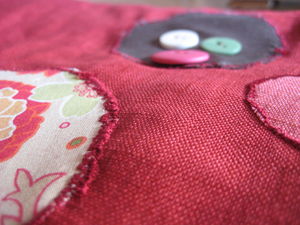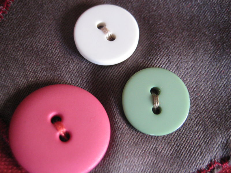 Détails (avec la loupiote de la machine à coudre qui est tombée en panne, je n’ai pas réussi à faire mieux !). Les boutons sont d’ailleurs (aussi) là pour masquer les défauts !