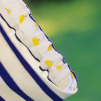 Cette jupe MINI-PERLE est réalisée dans un jersey marin acheté chez “Tissus Marin Broderie”. La doublure de ceinture est coupée dans ce même imprimé “pommes jaunes” vu plus haut (acheté chez Anna Ka Bazaar), entoilée pour un meilleur maintien, et gansée par un biais lurex argenté.