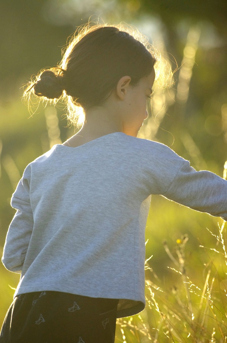 La jupe MINI-PERLE est ici portée avec un petit sweat tout doux (patron maison), confectionné dans en jersey-molleton gris clair acheté chez Vêtements-Marins-Broderies. Les petits empiècements d’épaule et de bas de manches sont quant-à eux réalisés dans un jersey molleton complètement coordonné et réversible (édition “Pic du soir” acheté chez Camillette Créations). Les lignes d’assemblage sont toujours soulignées avec ce joli passepoil noir brillant (Cousette).