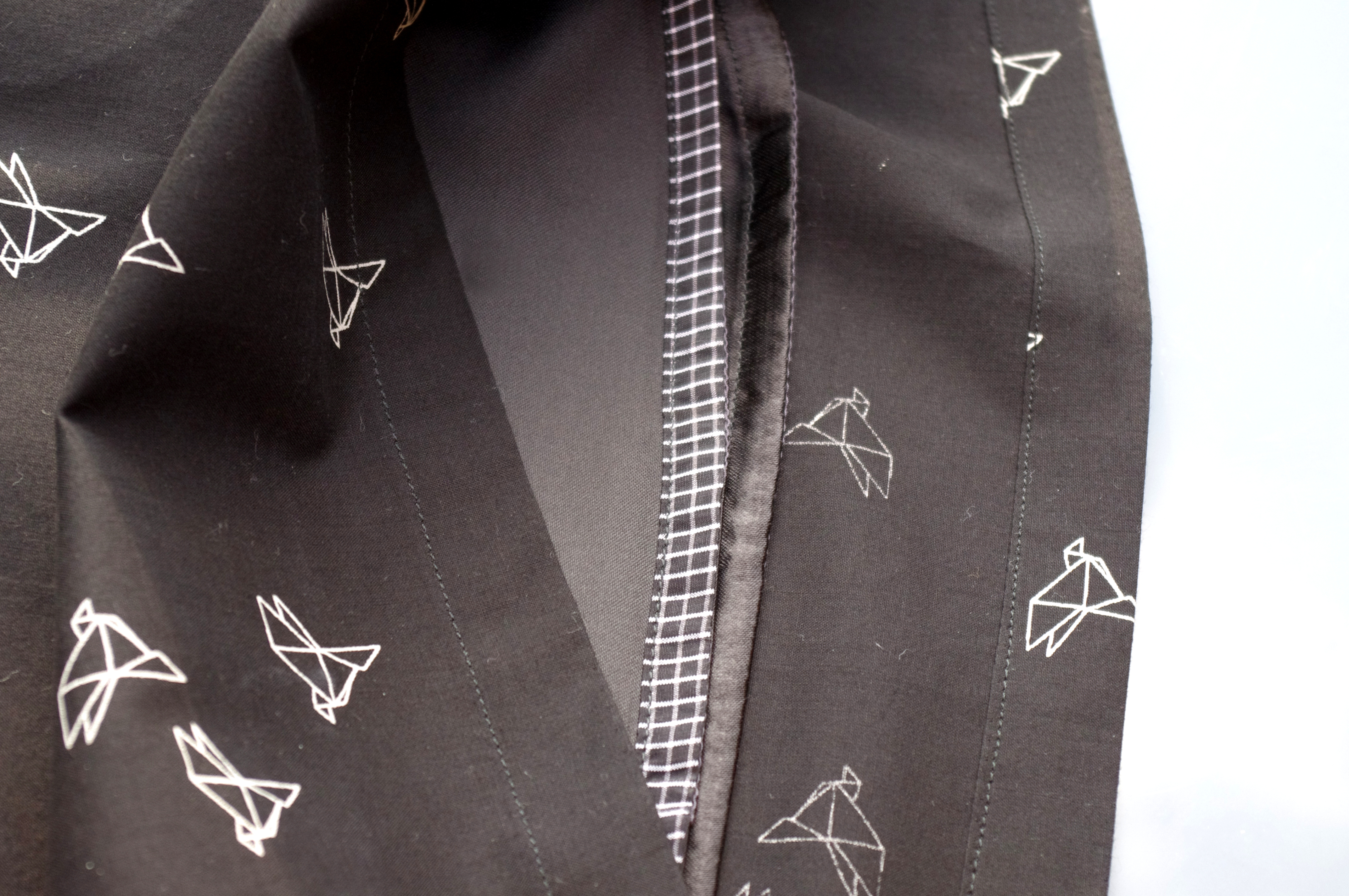 Je réalisé ma version avec un bel imprimé origami moderne (modèle “Bye-Bye Birdie black” de la marque Atelier Brunette) acheté chez Little Fabrics. Les lignes de poches et de ceinture ont été passepoilées d’un joli liseré noir brillant (acheté chez Cousette).