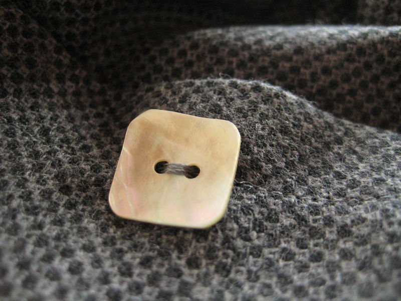 Gilet court sur une base d’Arthus de Citronille, adaptation en taille kid, en laine bouillie gris anthracite (Toto), et poche tricotée en laine-Alpaga Natura (Bergère de France) aig. 8.5. Bouton de nacre La Droguerie.