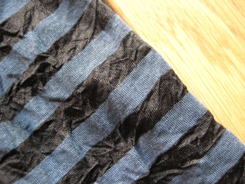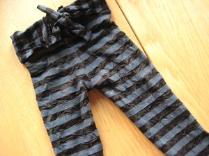 Leggings basés sur le modèle de pantalon des “Intemporels Enfants”, en une matière type “lycra” rayée bleu/noir et légèrement froissée, from Mondial Tissus.
