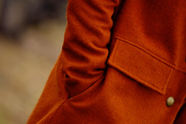 L’inspiration Sézane est à la fois proche et éloignée de cette version. Elle m’a surtout suggérée ce jeu de poches sympa avec l’association poches à rabat + poche passepoilée unique quelques centimètres plus haut. Et puis ce style aussi : un tombé bien net, ce col tailleur, un lainage qui se tient bien, la coupe droite et efficace, et une longueur très tendance. Au delà de l’inspiration, c’est aussi une bonne dose de motivation que j’ai reçue, celle qui dit “Nan mais là, je serais capable de le faire moi‐même !”