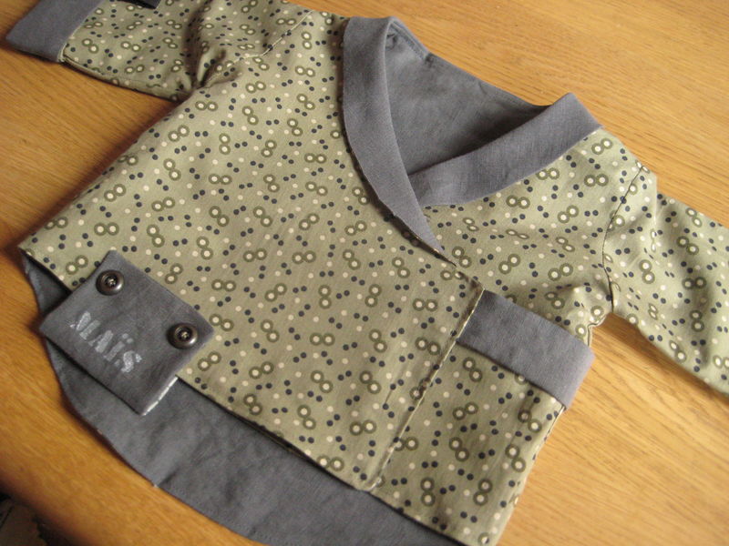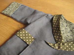 Kimono patron maison, taille 1 an, côté “pile” en lin gris (Toto), imprimé étoilé kaki, imprimés à pois (C’est Dimanche et Fat Quarter Shop), Liberty Meadow vert (La Droguerie)