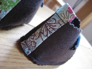 Chaussons en feutrine chocolat La Droguerie, customisé façon Maïs, avec imprimé chocolat à pois (Bouchara), imprimé bleu-mentholé PPMC, et petits boutons assortis.