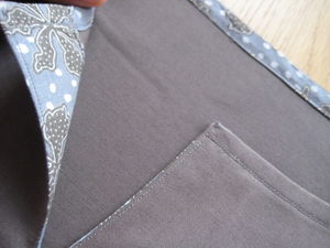 Inspirée chez Fil Hélène Point Comme… , j’ai également rajouté un biais tout autour de la fente des manches et remplacé le lien à nouer sur les manches par un gros bouton (cousu sur sa face “envers” car l’endroit n’était pas dans les tons…)