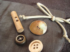 Détail poche en lin chocolat aspect chintz (Etoffe des Héros), boutons en tous genres (métal, bois, nacre) et cordelette beige du marché